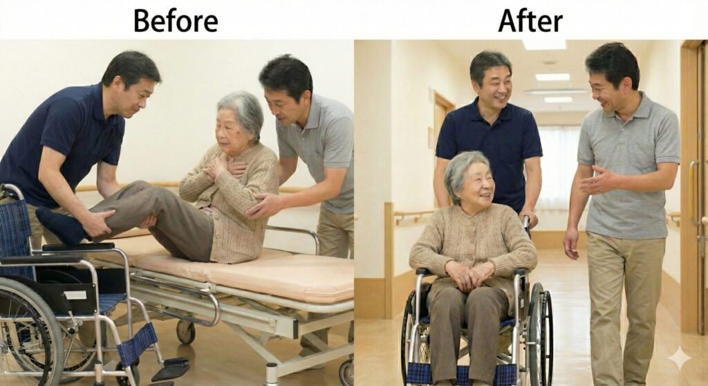 - 撮影スペースに入居者さまを車イスで移動するだけなのでスタッフの負担が少ない